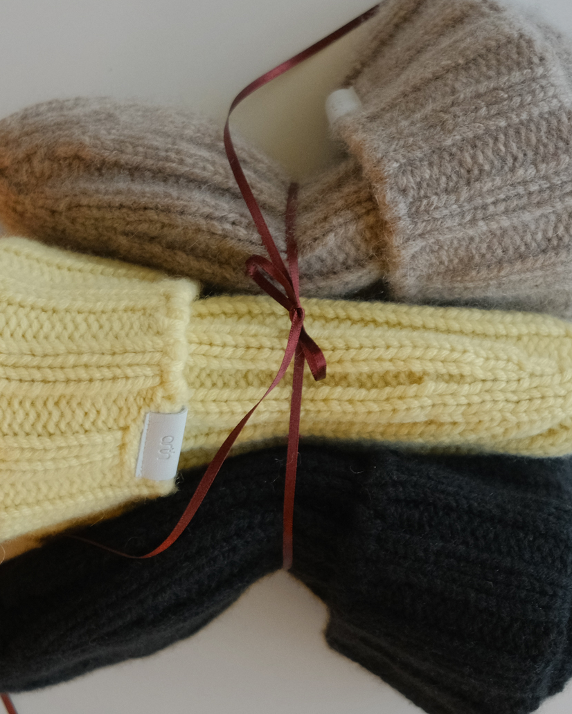 カシミヤ100%の糸を贅沢に使用したローゲージのリブ編みニットワッチ。