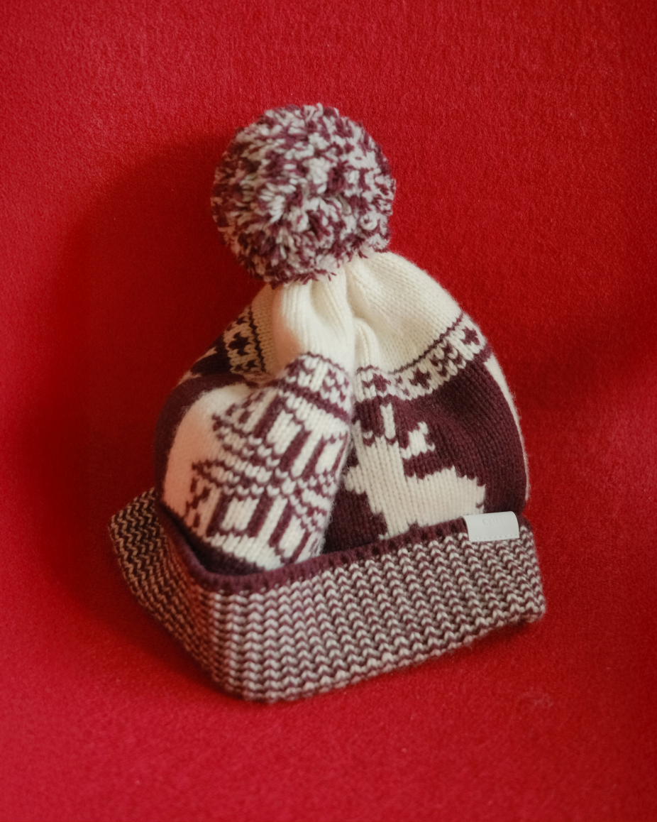 ジャッカロープと雪の結晶柄を織り込んだジャガードニットキャップ。